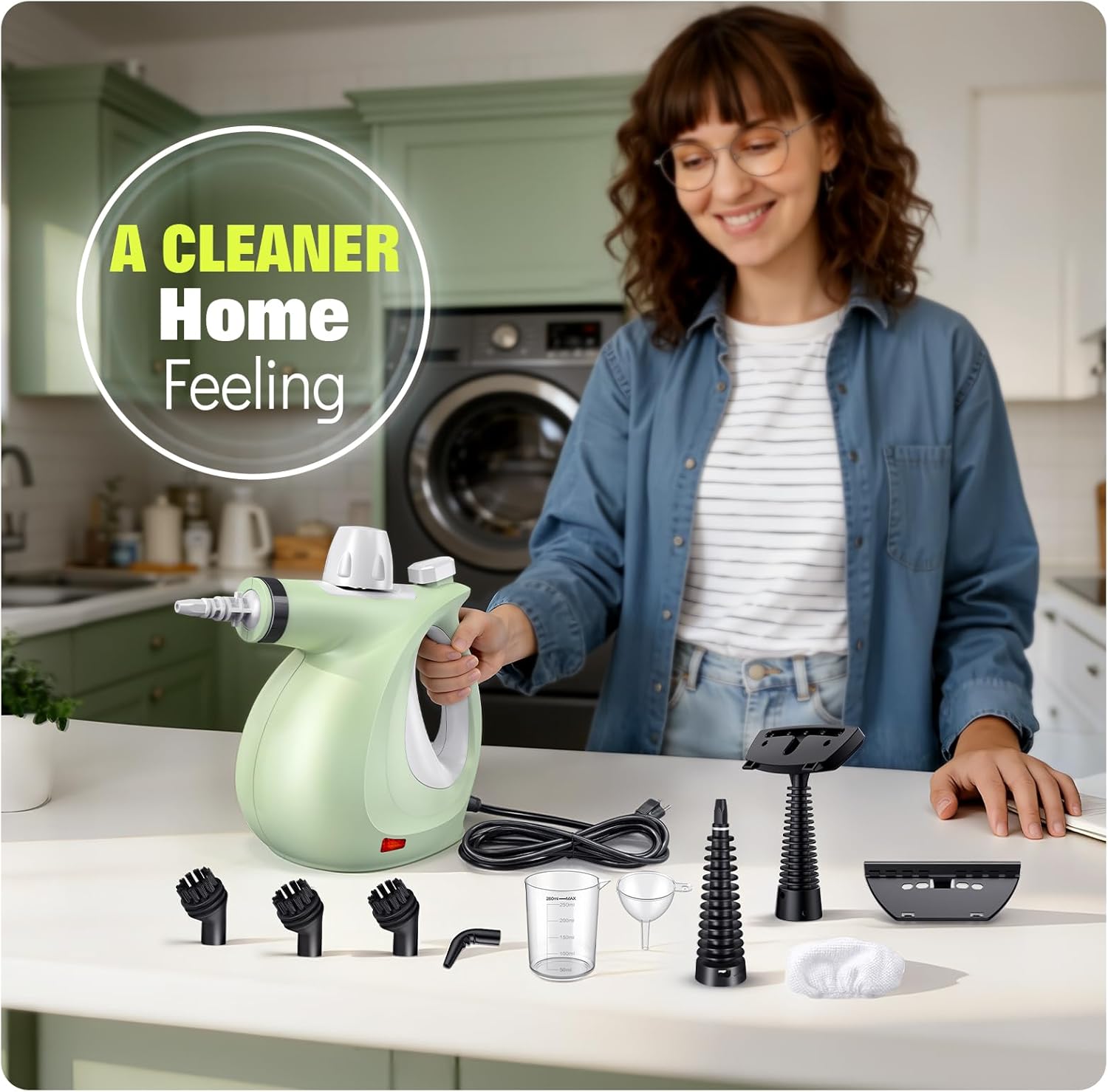 | Special Features | 100% chemical-free cleaning, safe choice for families, kids, pets, and anyone sensitive to harsh chemicals, Extended reach & freedom, a 9.8 ft power cord and handheld design make it easy to move around your home or car, while the 11.8 oz tank supports longer cleaning sessions with fewer refills; compact for easy storage, yet powerful for deep cleaning, with fast heat-up for time-saving performance so you spend less time waiting and more time enjoying a spotless home, Powerful 1200W steam, fast heat-up to 230°F, pressurized steam helps cutting through grease, grime, soap scum, and tough stains in seconds, multi-surface versatility, from kitchen counters to bathrooms, furniture, toys, grout, and windows, one tool does it all, safe & reliable, durable design ensure long-lasting, worry-free performance, on-demand steam control, instant trigger lets you release steam exactly when you need it, complete cleaning kit, includes 11 specialized accessories for targeted cleaning on every surface |