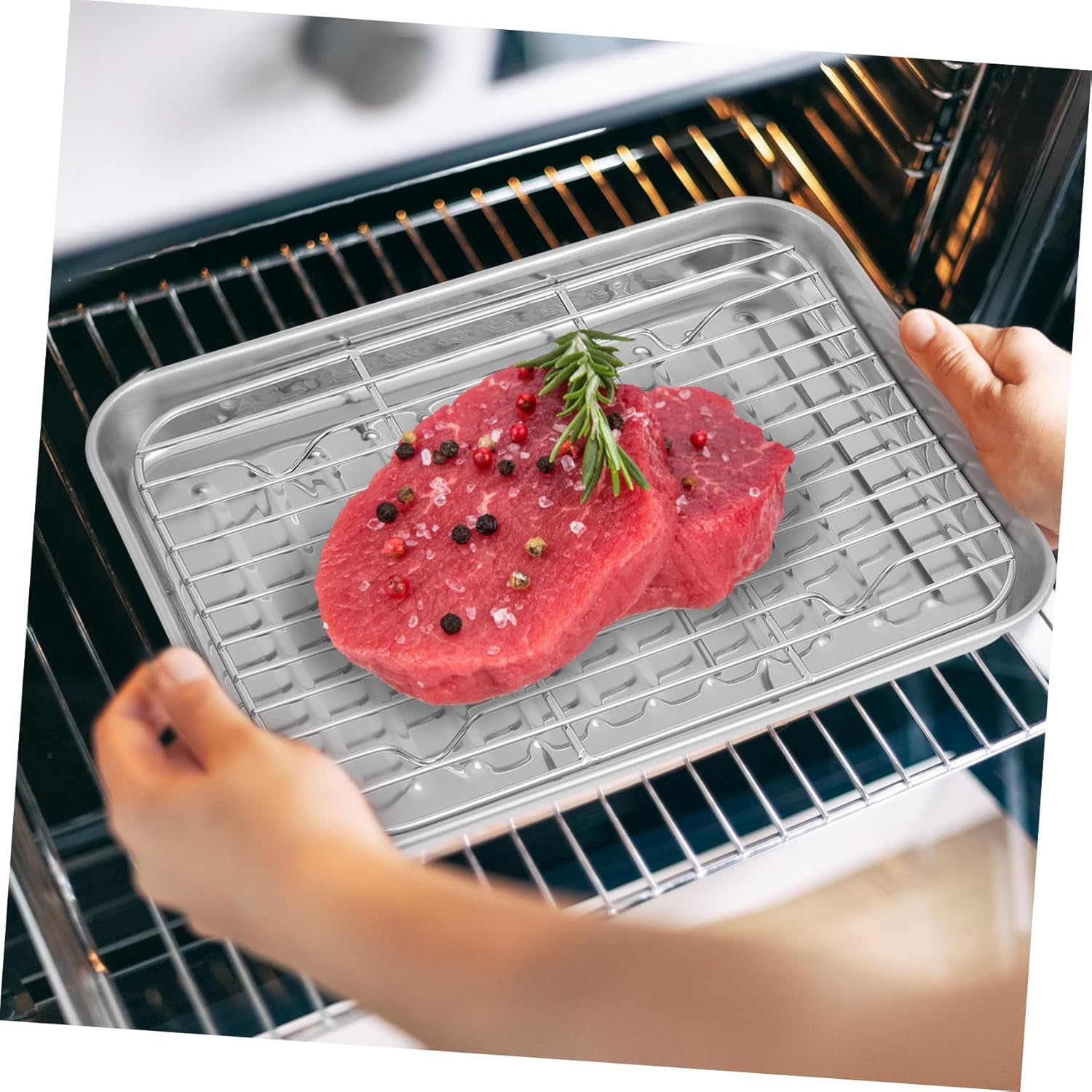Package Include 2 x trays 2 x wire racks Characteristics - Ample Usage: With their generous dimensions and multiple pan set options, baking pans provide ample space for all your cooking needs oven tray with wire rack -Material:Stainless steel cooking tray with wire rack - Convenient to Use: These baking trays are easy to grip. The ergonomic edge and lightweight construction make it simple to use Oven Tray - Sturdy and Strong: Constructed with a robust and solid structure, these baking pans are built to last and withstand frequent US tray for toaster oven -Color:Silver baking trays -Size: 23.50X17.60X2.50cm/9.24X6.92X0.98in wire rack for baking - Multi Purposes: The oven trays are ideal for baking cookies, roasting meats, and preparing a variety of other dishes, making them a versatile tool baking tray rack - Convenient to Clean: Thanks to the non-stick coating and stainless steel material, these baking sheets with wire rack are incredibly simple to clean wire baking rackGoods Informationwire baking rack Experience the convenience of out Stainless Steel Cookie Sheet with wire rack, suitable for various baking needs.bake tray Cleaning up is also easy thanks to the non-stick coating on the surface of the tray.wire rack for baking Not only does this baking tray has great durability, but it also offers a large capacity