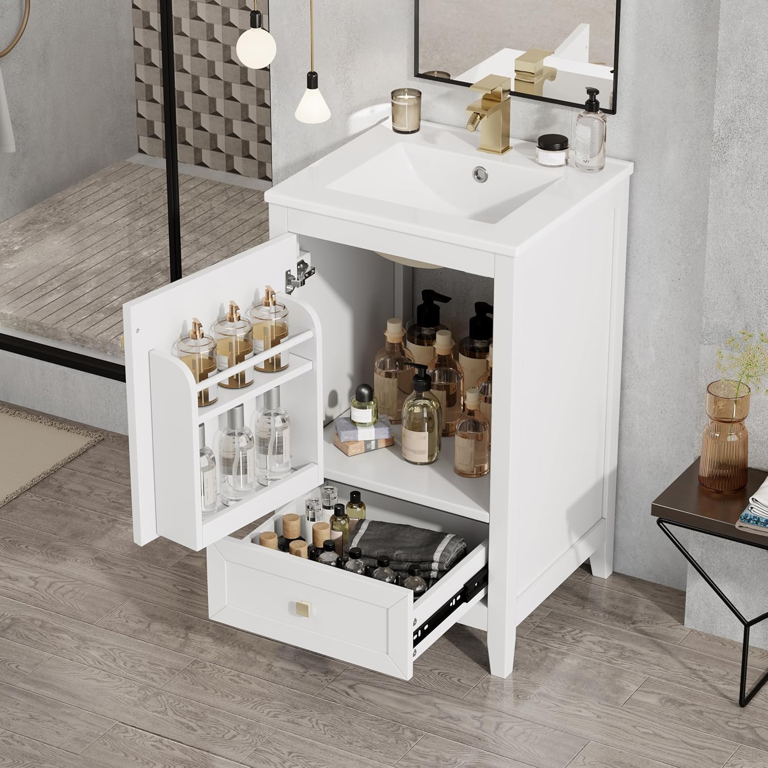 A bathroom vanity is a crucial furniture in every bathroom.In a humid environment like the bathroom, a furniture needs to take into account the storage requirements of different items.In that case, different functional zones are particularly important. Storage cabinet and drawer offer more options for storing a lot of daily sundries. And these metal handles ensure the comfort using experience. Users can choose the suitable storage space to place the right items.Wooden structure and MDF boards guarantee the stability and durability in long-term usage. Ceramic basin ensures the smooth touch experience and easy cleaning process, and there are necessary functional holes.This product also shows elegant and rigorous temperament, thus, it's very suitable for your different bathroom decoration style.