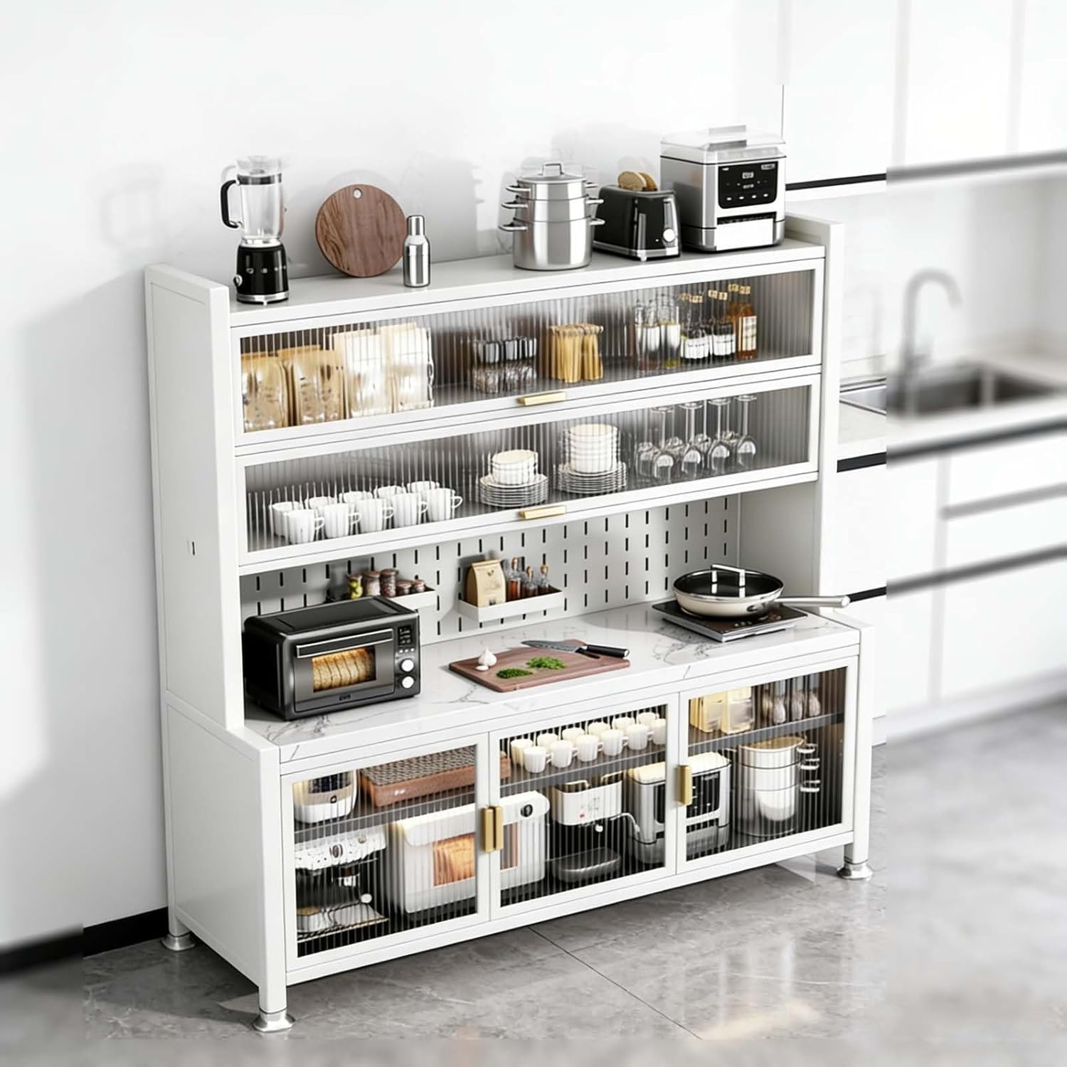 Introducing our versatile 6-tier kitchen storage rack, designed to elevate your kitchen organization while maximizing space. This multi-functional unit serves as an ideal microwave stand, coffee bar, or pantry cabinet, making it perfect for storing appliances, dinnerware, and essentials. The innovative DIY pegboard allows you to personalize your storage by hanging mugs and tools, tailoring the setup to fit your unique needs. Crafted from robust carbon steel, this kitchen cabinet is built to last, offering strong load-bearing capacity, water resistance, and easy maintenance—simply wipe it clean with a damp cloth. With see-through flip doors, your items stay dust-free while providing a stylish view, seamlessly combining aesthetics with practicality. This kitchen storage solution is perfect for small kitchens, busy families, and home chefs looking to streamline their cooking space. Assembly is a breeze—set it up in just 15 minutes with all necessary hardware included. Transform your kitchen with this functional and stylish storage rack, and enjoy a more organized cooking environment today!