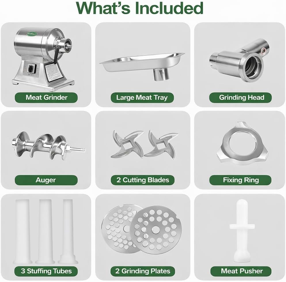 | Included Components | 2 Blades, 3 Sausage Stuffer Tubes, 1 Pusher, 2 Grinding Plates |