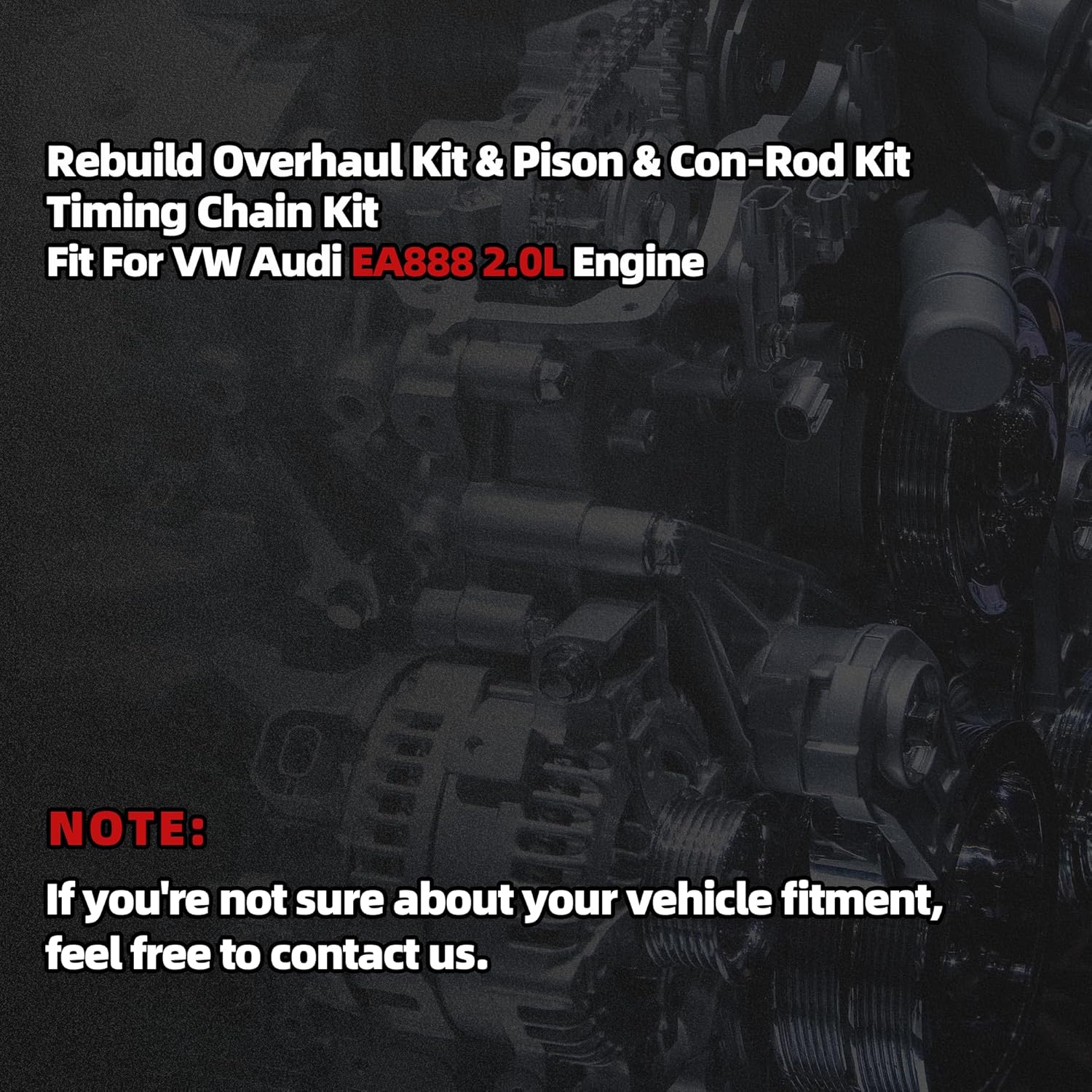 Fitment Fit For VW Jetta 2.0 TSI 2009-2011 Fit For TT / TT Quattro 2.0 TFSI 2007-2010 Fit For Passat 2.0 TSI 2008-2011 Fit For Scirocco 2.0 TSI 2009-2011 Fit For Tiguan 2.0 TSI / 2.0 TFSI 2008-2011 Fit For Golf GTI 2.0 TSI 2008-2011 Fit For EOS 2.0 TSI 2009-2011 Fit For Passat CC 2.0 TSI 2009-2011 Fit For A3 / A3 Quattro 2.0 TFSI 2008-2011 Fit For Audi A4 / A4 Quattro 2.0 TFSI 2009-2011 Fit For A4 Allroad Quattro 2.0 TFSI 2010-2011 Fit For A5 / A5 Quattro 2.0 TFSI 2008-2011 Fit For Q5 2.0 TFSI 2009-2011 OE Part Number Bearings: 06H105701D Timing Chain Kit: 06H109158H, 06H109158J, 06H109467N, 06K109467K Piston: 06H107099AM, 06H107065AM, 06H107561L, 06H107591L, 06H107065DM, 06H107065AB Head Gasket Set: 06H103483D, 06H103484A Package Included Gasket, Bearing, Timing Chain Kit, Tensioner, Piston Kit, Valves Customer service 1 Year Note Please check picture, OE part number and fitment information to verify this is the correct one you need before purchasing.