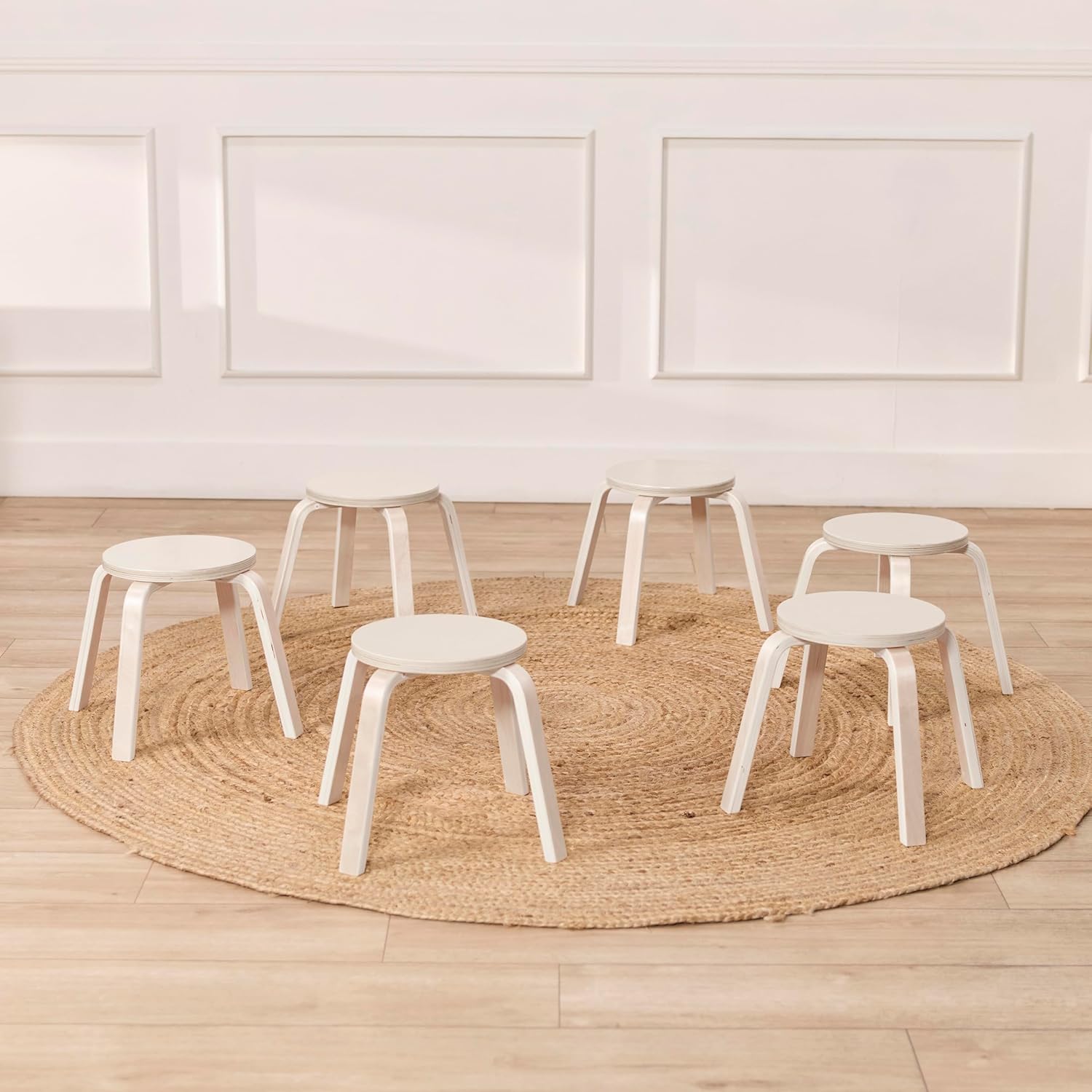This 6-piece set of Bentwood Stools with curved wood is great for circling up or placing around an activity table to enjoy crafts, story time, or snacks. Build engaging educational spaces to promote confidence and independence with child-sized furniture. Backless stools with round tops allow students to quickly and easily pair up or work in small groups. Wooden stools feature a 12" seat height that complements tables 18-22" high. These children's seats neatly stack to save space or slide under your table for a smaller footprint. The lightweight design makes it easy to move around the room for a flexible seating option, which supports a child's need for autonomy and independence. Stools feature a smooth finish, rounded edges for safety, and felt glides to help prevent floors from scratching and reduce noise. Constructed from birch plywood that is molded into shape creating a solid natural hardwood. A durable finish seals the surface and resists scratching. A UV inhibitor makes furniture resistant to ultraviolet light and yellowing. Natural birch plywood is extremely durable and will hold up to everyday use in daycares and preschools, great for the home.