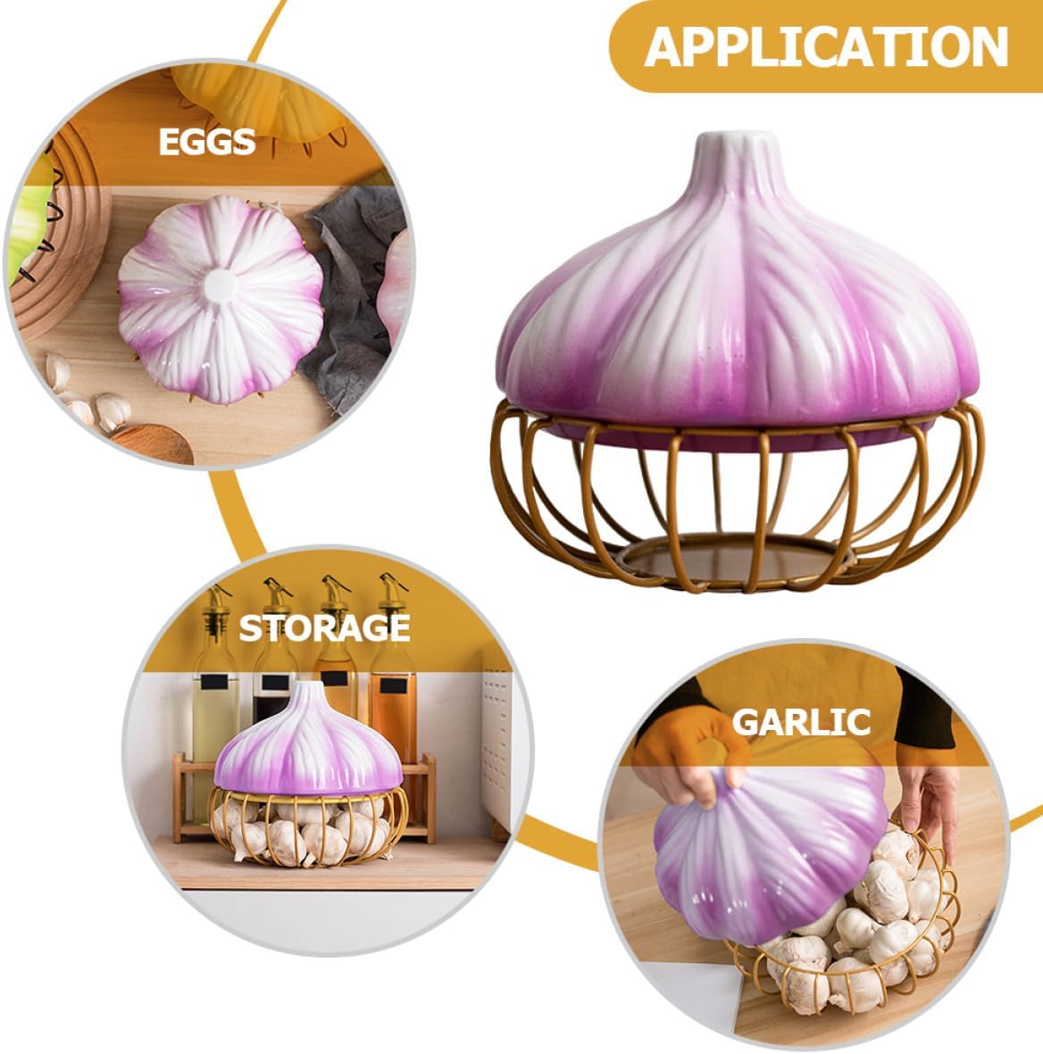 Package Include 1 x Basket Characteristics -Color:Multi -Material:Ceramic, iron -Product Info:Garlic storage basket -Size:17.00X17.00X16.00cm/6.68X6.68X6.29in -The excellent workmanship of our product will bring you a Convenient Garlic Container. -Very suitable for storing garlic, ginger, pepper, fruit, eggs, snacks, etc. A beautiful storage rack for your home kitchen metal egg holder. -The storage basket is perfect for home, restaurant, buffet, hotel, party and more Household Egg Basket. -This storage basket can help keep your kitchen countertop tidy and save space Household Garlic Container. -Fine workmanship and beautiful garlic shaped appearance its popularity and practicality eggs collecting basket.Goods Descriptiongarlic holder Large storage space, can store more things.Household Garlic Keeper This is a kitchen storage basket, manufactured with premium iron and ceramic material, which is practical and safe to use.egg storage for kitchen Providing plenty of room to organize eggs, fruits, vegetables and other goods