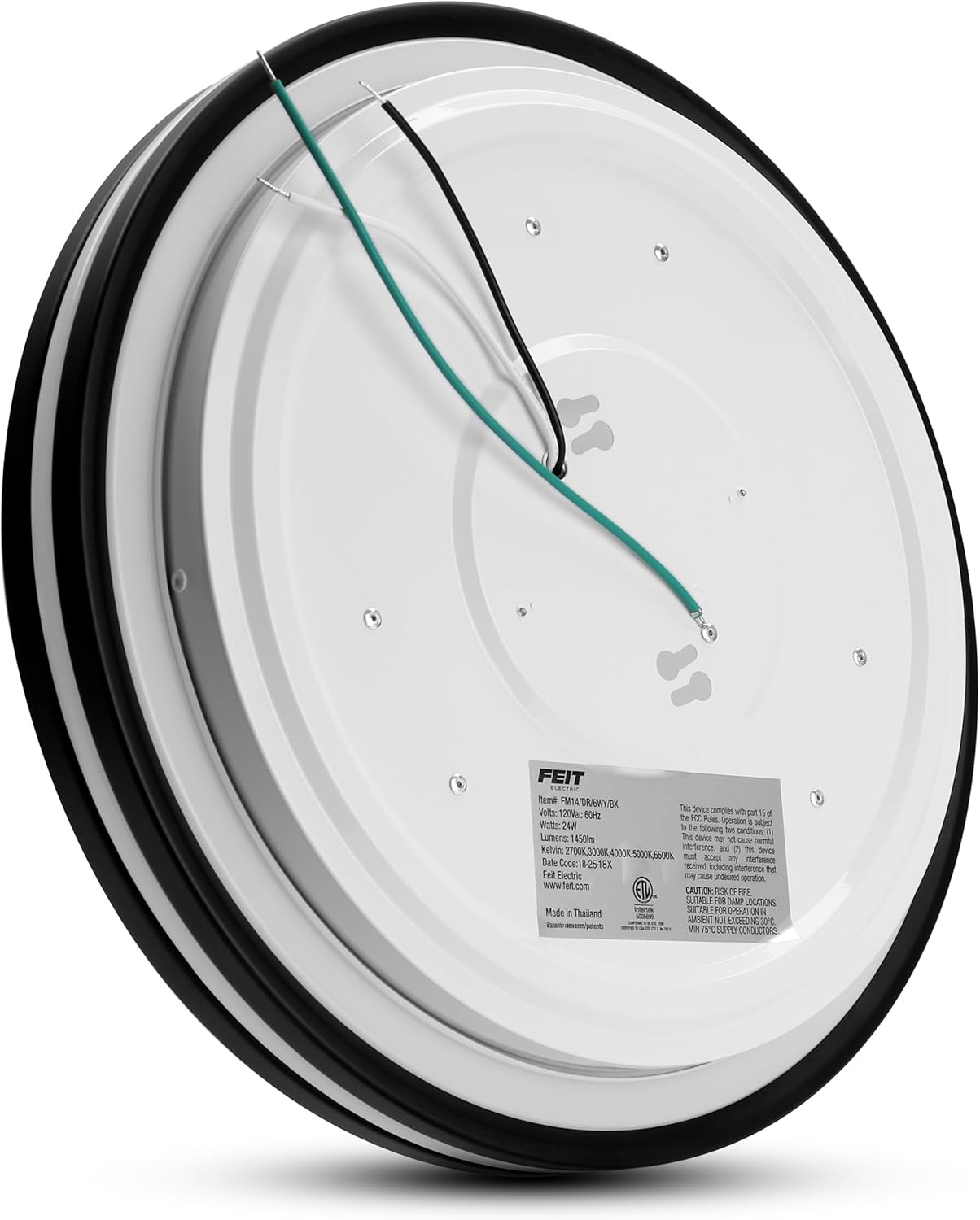 Upgrade your home or business lighting with the Feit Electric Adjustable White LED ceiling fixture. This modern fixture offers the perfect blend of style and functionality. It features rust-resistant metal housing in a dual-banded matte black finish and a frosted lens to complement any contemporary space. The low-profile design provides bright light without feeling bulky. Easily mount it flush against your ceiling for a clean look. Integrated, dimmable LEDs deliver bright, flicker-free light. Adjustable White light lets you preset your preferred color temperature using the toggle on the fixture or switch anytime from a wall switch. Match your current lighting or get the perfect light in every room for every mood. Save money on your energy bill with this energy-efficient fixture. Its low energy use and long lifespan of 50,000 hours means fewer light replacements. The Feit Electric Adjustable White ceiling light is perfect for kitchens, bedrooms, living areas, offices, and anywhere you need beautiful, versatile lighting.