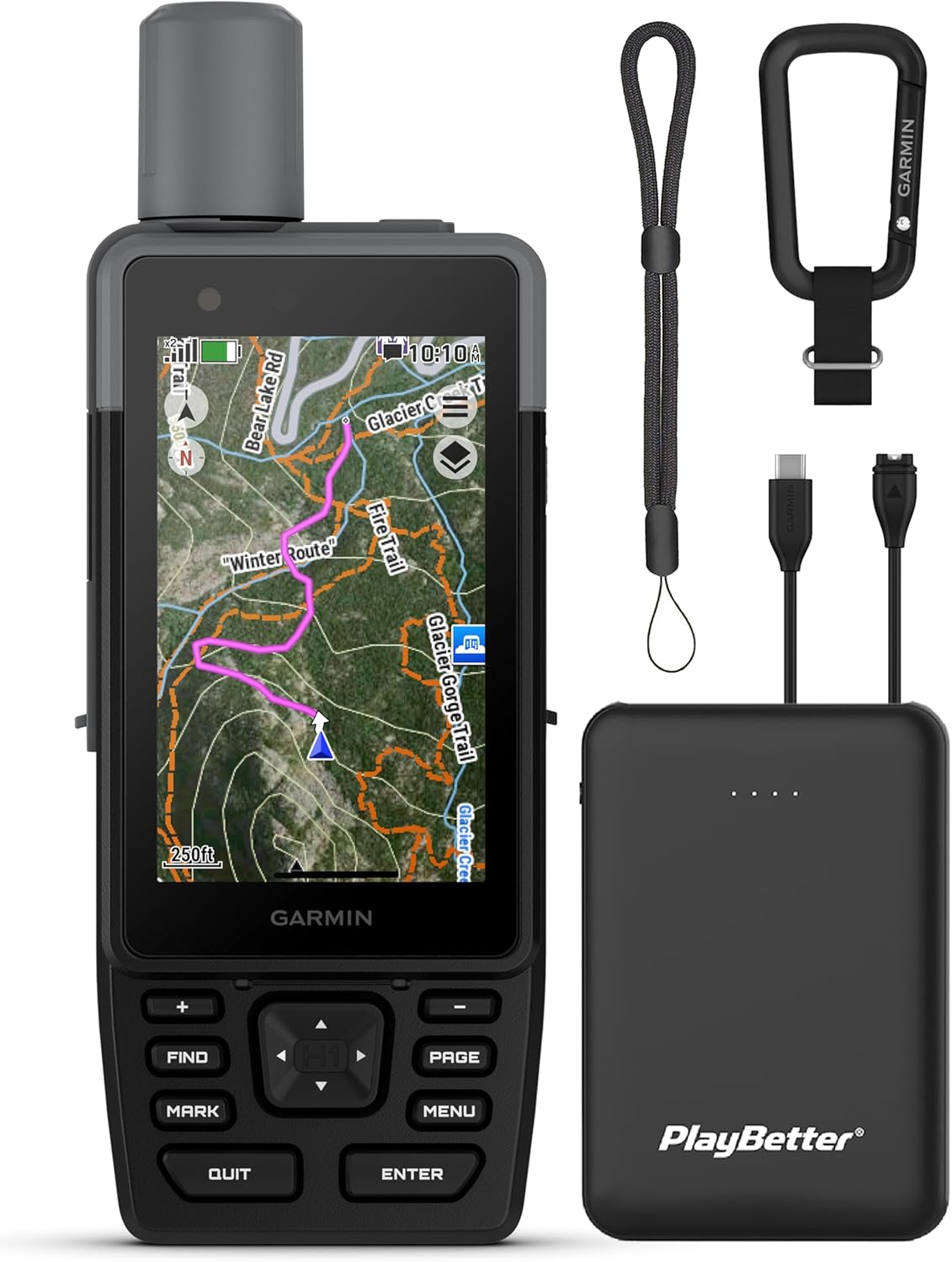 | BuiltIn Media | Charging/Data Cable & Documentation, Garmin GPSMAP H1i Plus Premium GPS Handheld Navigator, Loop Carabiner, PlayBetter GPS Tether Lanyard (Black), PlayBetter Z05 5000mAh Powerbank |