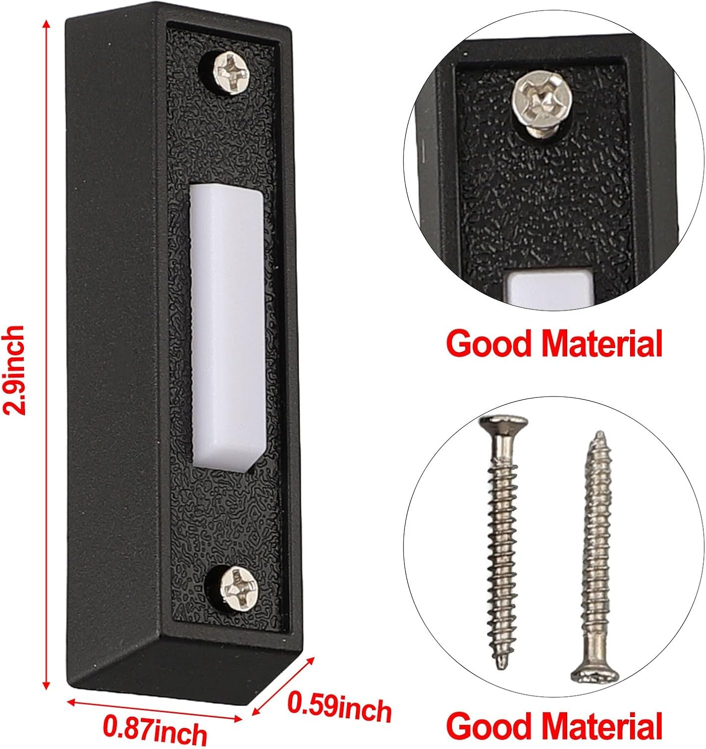 Features:*Lighted Doorbell Button:This wired door bell push button features a built-in light, visibility even in low-light conditions. Say goodbye to missed visitors or deliveries.* Door Chime:The door chime provides a visual indicator of incoming guests or visitors, making it a convenient and practical addition to your home. No more relying solely on audio cues.*Wall Mounted:This doorbell button is designed to be easily mounted on walls, offering a sleek and space-saving solution. It seamlessly blends with your home's aesthetics while providing functionality.*Easy Installation:Installing this wired door bell push button is a breeze. With a straightforward setup process, you can have it up and running in no time. No complicated wiring or technical expertise required.*Reliable Performance:Built with durability in mind, this doorbell button ensures long-lasting performance. It is made from high-quality materials, providing reliable functionality over time.Specifications:*Product Name:Wired Door Bell Push Button*Material:ABS*Size:About 2.8x0.86x0.59 inch/7.2x2.2x1.5 cm(L*W*H)*Color:BlackInstallation precautions:Red+is the positive poleVoltage range: DC12-24VPackage Content:1 * Door Bell Push ButtonNote:1. The real color of the item may be slightly different from the pictures shown on website caused by many factors such as brightness of yourand light brightness.2. Please allow slight manual measurement deviation for the data.