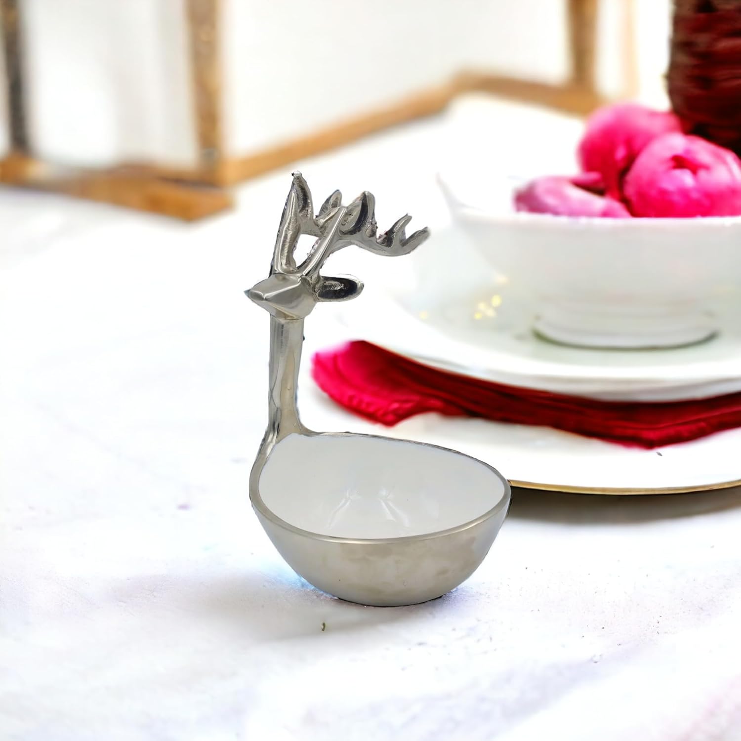 Add a touch of Nordic elegance to your home with this striking decorative aluminum bowl featuring a distinctive deer antler handle. The sleek metallic silver finish creates a contemporary aesthetic while paying homage to Scandinavian design traditions. Measuring 5.90 inches in width and 8.26 inches in height, this versatile piece works beautifully as a decorative accent or serving bowl. The sculptural deer antler handle adds both visual interest and functionality, making it easy to transport or display. The bowl's generous size makes it perfect for displaying seasonal items, holding fruits, or serving snacks at gatherings. The durable aluminum construction ensures this piece will maintain its lustrous appearance for years to come. Whether placed on a dining table, sideboard, or coffee table, this distinctive bowl makes a sophisticated statement in any room.