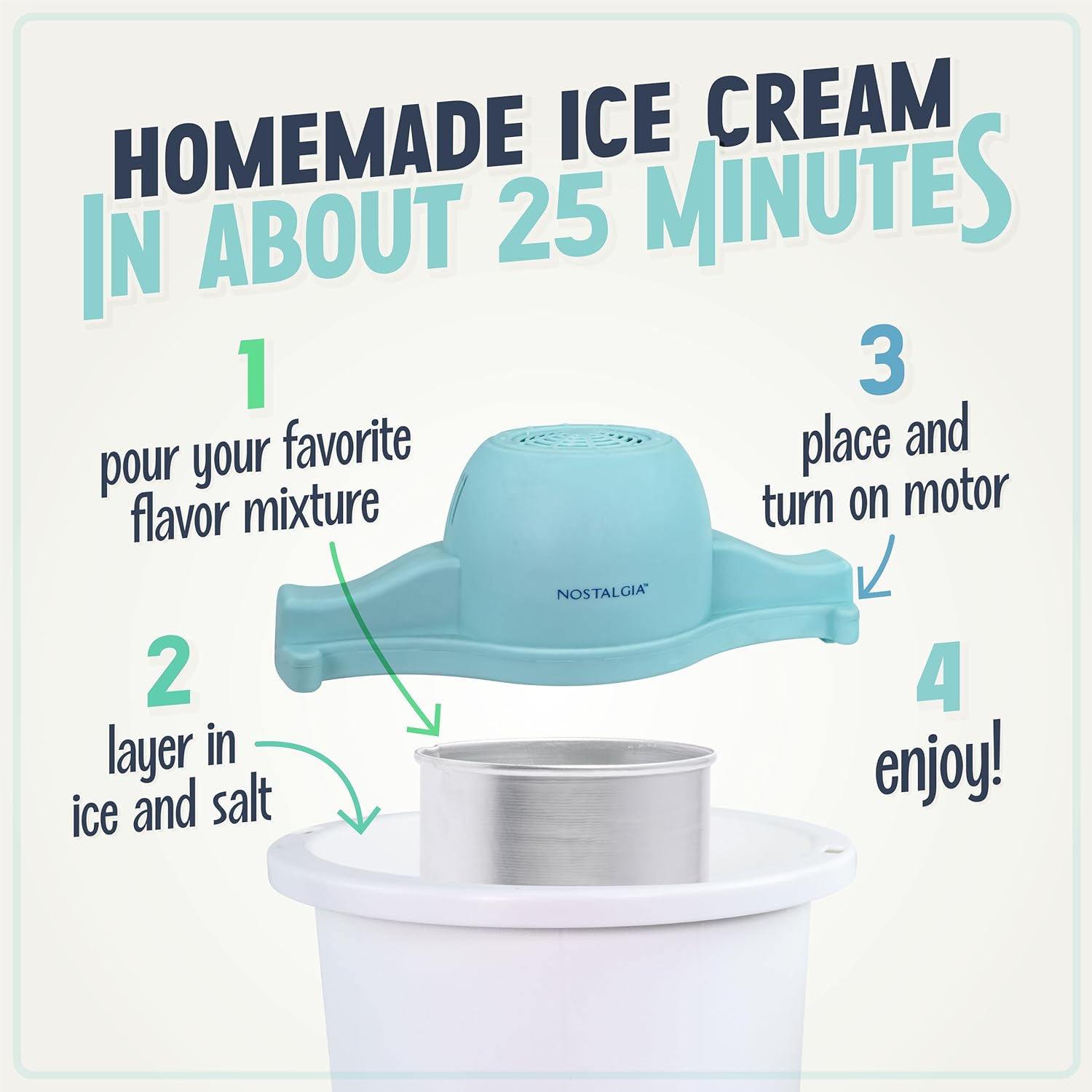 Gather the whole family and enjoy a fun-filled ice cream-making experience with Nostalgia's Electric Ice Cream Maker. You can make ice cream, sorbet, and gelato whenever and wherever you want. Add your ingredients into the aluminum canister, place in the middle of the bucket, layer with ice and salt, and let the electric motor do the rest. Customize each recipe by adding extras, like strawberry preserves, cookie dough, candy, and cookie pieces. When you're all done, use the included lid and cap to store leftover ice cream in the freezer.