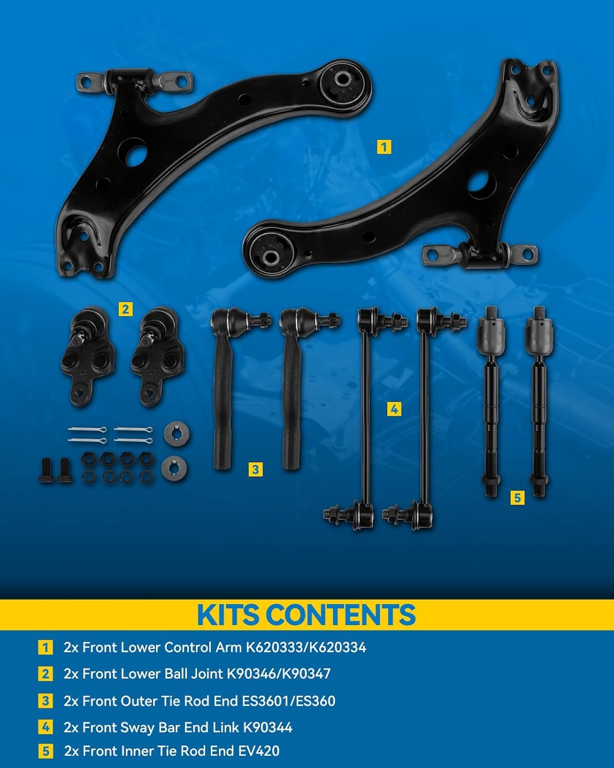 | Included Components | Front Upper Lower Control Arm w/Ball Joint Sway Bar End Link Tie Rod End |