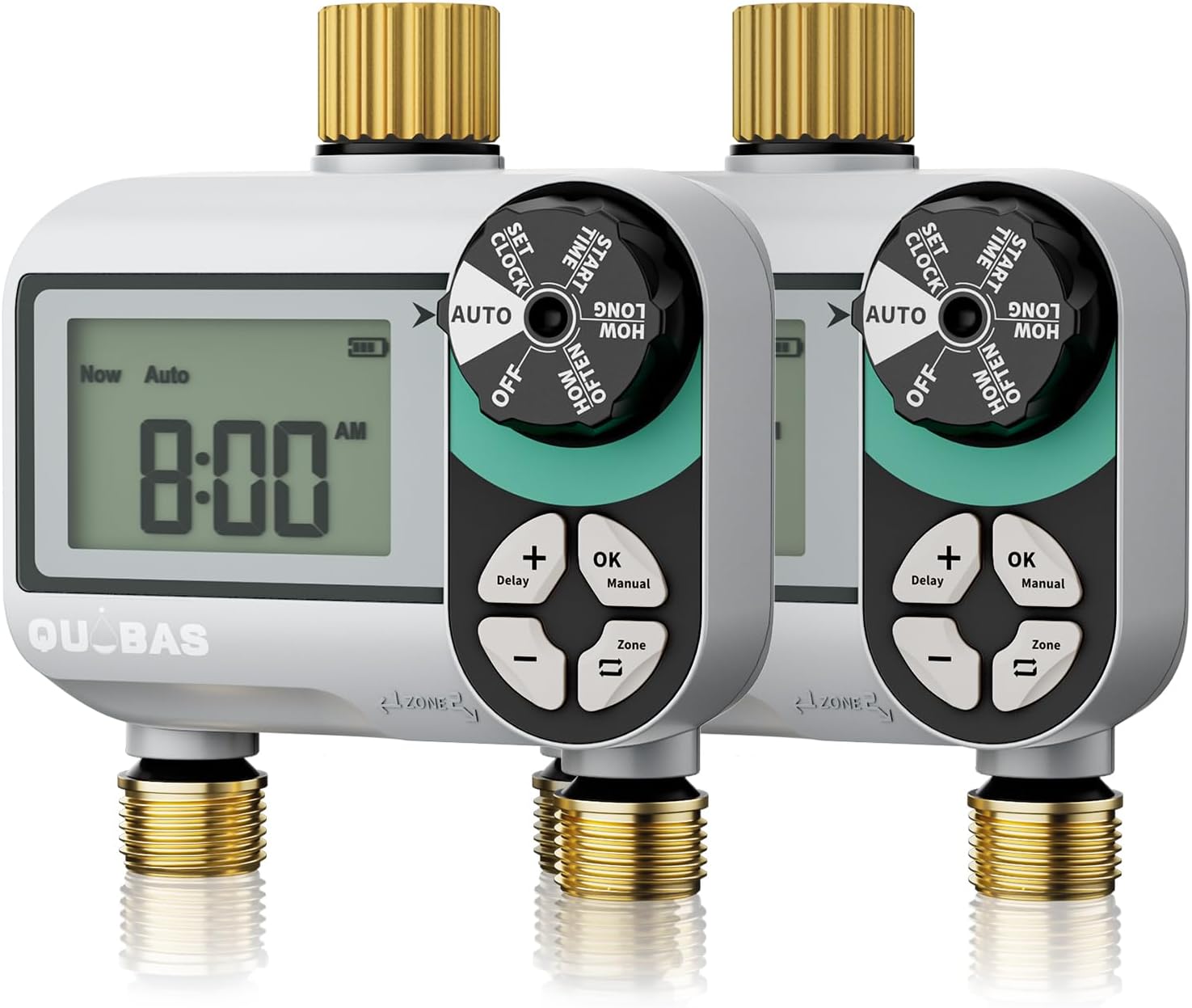 QUOBAS Brass Sprinkler Timer, Programmable Water Hose Timer for Garden Hose Faucet with Waterproof LCD Screen, Rain Delay/Manual/Automatic Irrigation Watering System for Garden, Lawn, Yard - 2 Zone