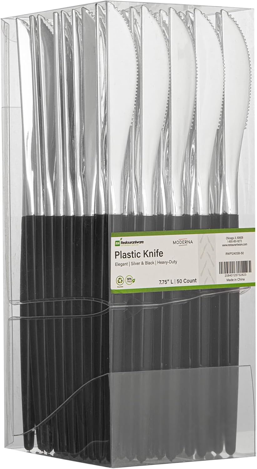 Cut your grilled chicken easily using our Moderna Silver Plastic Knives. These plastic knives are made from premium polystyrene material, making them highly durable. With a black handle, these disposable plastic knives give you a firm hold while cutting your meat. The serrated edge of these disposable knives lets you slice your food easily. To accelerate your post-event cleanup process, these plastic silverware knives are disposable. With a beautiful metallic silver shade, this silver plastic cutlery exudes a royal touch to your feast. Measuring 7.75 inches in length, this disposable silverware can be used for hot or cold foods up to 167F. Sold in a 500 count box.