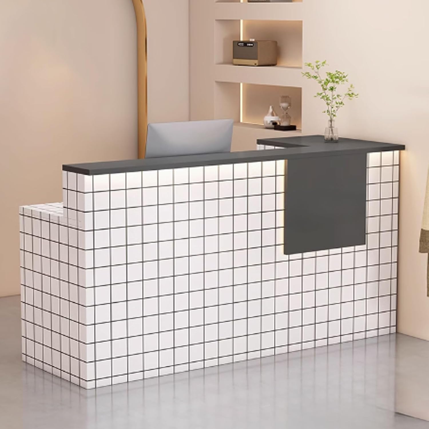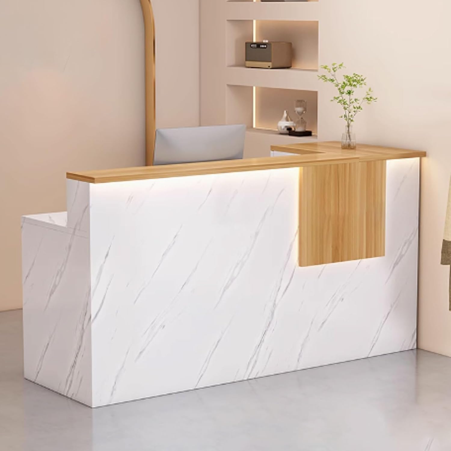 GUQASDV receptionist desk for salon will be a helpful solution to keep your work essentials organized and your workspace neat in reception area to improve work efficiency and create high-end sense to the scenesFine workmanship: processed by fine workmanship, every details are exquisite without burrs, reception desk with counter will not make hurts easily even for kidsInstallation: please check out all parts are received and intact before the assembly process. We recommend 2 person to assemble it together and follow the directions in the manualMaterial: Engineered WoodLights: LED light stripsColor: white texture + natural,white texture + gray, white texture + white, white texture + light brown, white + natural, white + gray, white + light brown,white + white, beige + light brown,beige + gray, beige + white, beige + natural, grid + gray, grid + light brown, grid + natural, grid + whiteSize: 100x45x90cm, 120x45x90cm, 140x45x90cmNote: 01 There may be a 3-5cm error in manual measurement which is normal, please understand02 Due to different displays or shooting environments, the product may have color differences, please understand