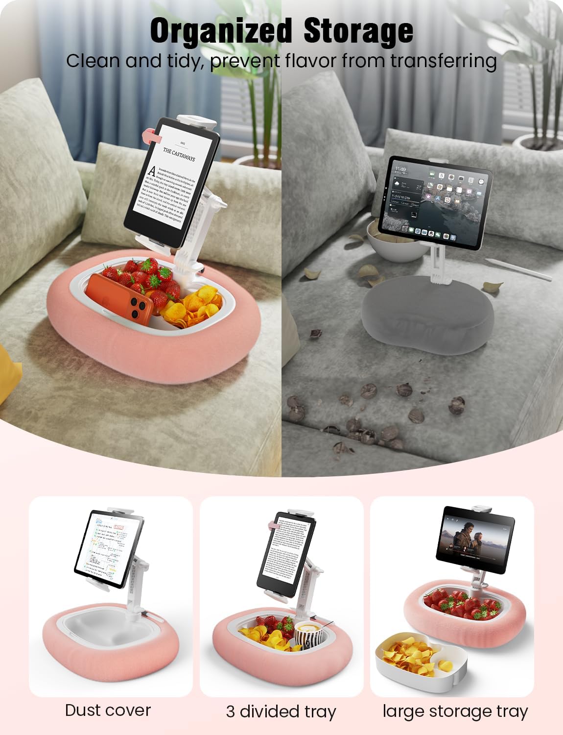 | BuiltIn Media | a pillow stand, assembled by a pillow, a food tray, a tablet holder |