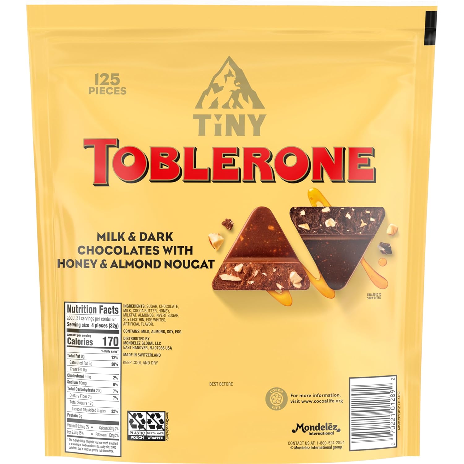 | Item Type Name | Toblerone Tiny Swiss Chocolate Candy Bars with Honey & Almond Nougat, Dark Chocolate, Milk Chocolate, 125 Ct Gift Bag |