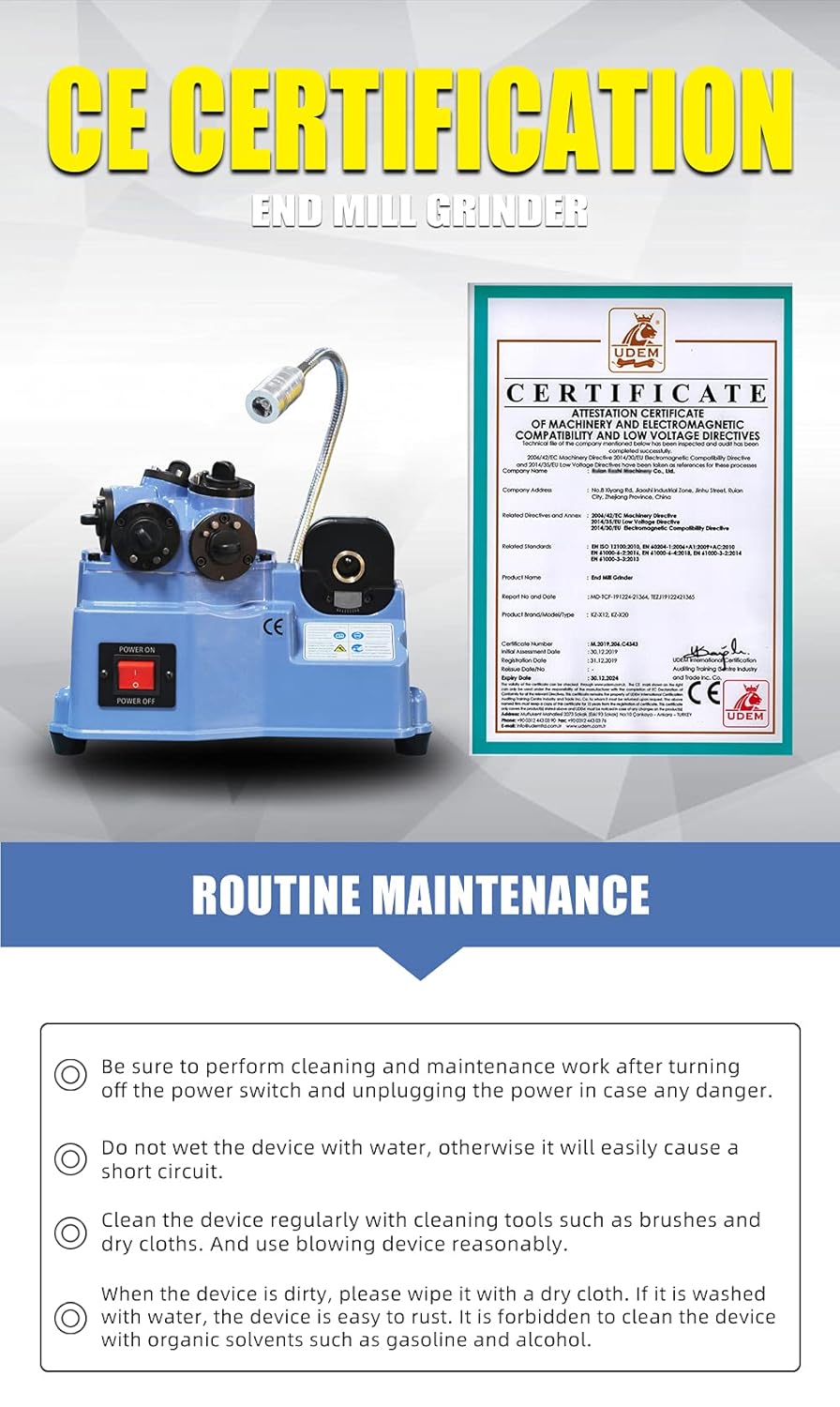 ParametersGrinding Dia.Dia.:ø2-ø12Universal Milling Cutter:2 flutes,3 flutes.4 flutesMilling Cutter Edge Grinding Angle:Flute angle 5°,the front bevel angle 20°,rear bevel angle 25°Voltage:220V 60HZ/110V 50HZ. Machine is 220V.Include or exclude transformers depends on the voltage at the receiving address.Us customers include transformers.Motor Speed:6000rpm-9000rpmOverall Dimensions:302*202*220(mm).Equipment Weight:7.5KGGrinding Wheel Matching Size:ø81*15Collet Positioning Specification:ø2-ø3/ø4-ø5/ø6/ø8/ø10-12 Product DetailsProfessional Tool Setting Device---Simple, Fast and Accurate Tool SettingNew Grinding Volume Adjustment Knob---No matter how worn the tool is, the grinding volume adjustment knob solves the trouble.Precision Ground Hole---Each of the grinding hole has a clear division of labor to ensure precise tool grindingAccessory Box---Milling cutters with different numbers of flutes and different diameters are equipped with special cases.Product CharacteristicsControllable Grinding Simple OperationIntelligent Shifting Improving EfficiencyAccessory Box ListCollet * 7pcs:Φ3,Φ4,Φ5,Φ6,Φ8, Φ10, Φ12Diamond Grinding Wheel * 1 pieceCollet Locating Ring * 15pcs:2 Flutes:Φ2-Φ3,Φ4-Φ5, Φ6, Φ8, Φ10-Φ12 3 Flutes:Φ2-Φ3, Φ4-Φ5, Φ6, Φ8, Φ10-Φ12 4 Futes:Φ2-Φ3, Φ4-Φ5, Φ6, Φ8, Φ10-Φ12