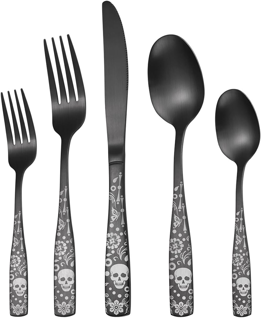 Are you looking for a durable and fancy Halloween cutlery set? Tableware is an essential tool in our daily life. A good set of tableware can bring you a better dining experience.The Halloween skeletal cutlery set design is inspired by the Halloween theme, exquisite skull & rose pattern laser design on the handle, full of fun and creativity, adding a festive ambience. It is very suitable for use during Halloween or as a gift to friends who love Halloween. Size: Dinner Knives: 8.9 inch Dinner Fork: 8.1 inch Dinner Spoon: 7.9 inch Salad Fork: 6.6 inch Tea Spoon: 6.6 inch Product Feature: High Quality Materials: High grade and safe stainless steel. Classic Designs: Classic Halloween skull patterns and exquisite laser carvings make the patterns on the handles more vivid. Nice Curve: Ergonomic design, comfortable to hold, elegant flatware set would elevate your everyday meals into a fine dining experience. Mirror Finish: The mirror polished surface always keep shiny. Easy to clean and maintain, your proper care can make this black stainless steel silverware set always look as good as new. Widely Usage: family dinners, friends gatherings, catering, also can be a nice gift for housewarming, Thanksgiving, Christmas, wedding, restaurant, hotel or daily use. Package Include: 8 x dinner forks 8 x dinner knives 8 x dinner spoons 8 x salad forks 8 x tea spoons